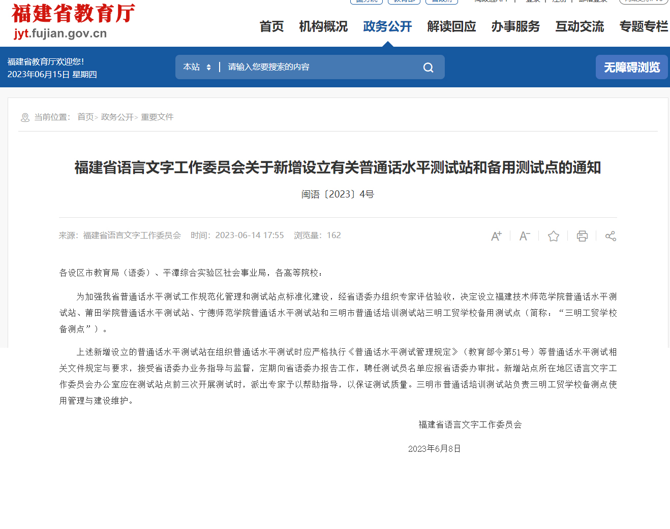 6月8日,福建省教育厅官网公布,公司正式获批设立“普通话水平测试站”。自此,公司可自主组织开展面向校内师生的普通话水平测试工作,标志着公司语言文字工作进入了一个崭新的阶段。