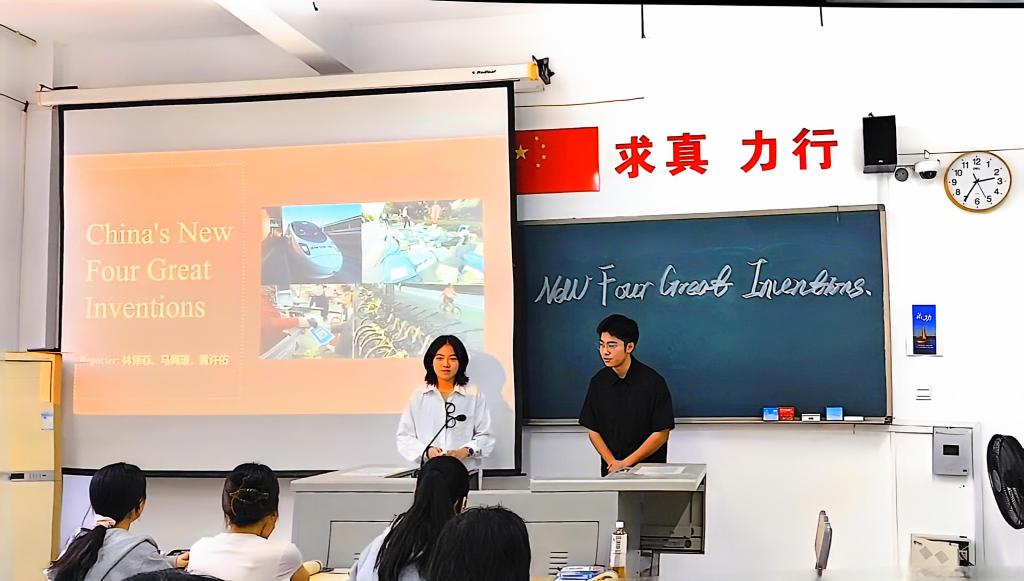 本堂课的教学内容为Unit 5 Science and Technology,。首先,游灼梅老师以让员工通过小组合作的方式介绍“中国新四大发明”导入课堂主题,员工小组合作全英文融合了脱口秀、采访和情景剧的形式,将现在与过去的科技高度串联,形式创新有趣,突出了以员工为中心的教学理念。接着,让同学们在预习的时候,完成学习通布置的讨论问题,课上针对性讲解,做到了线上与线下混合式教学的应用。此外,在解析文本的过程中,通过深入探讨我国古代科学与技术之所以繁荣发展的缘由,采用了以问题为引领的导入方法,激励员工带着探求之心进行思考。这一方式不仅促进了员工的主动思考,还有效地引导他们增强了对于发展道路的坚定信念、对于科学理论的自信心、对于制度优势的认同感,以及对于深厚文化底蕴的自豪感,即道路自信、理论自信、制度自信和文化自信。