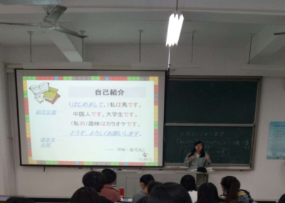 本节课的课题为“请多多指教”,课文内容比较简单,为了让日语初学者的2016级英语(师范)班的同学们,也为了让同学们能对日语这门语言更有兴趣,能够更好地掌握知识,尤斌斌老师采取了各种教学方法融入课堂。例如,在讲解生词时,为了让员工更好地理解【さん】(桑)【さま】(樣)【ちゃん】(酱)【くん】(君)这些称呼用语,尤老师给出了很多生动的例子,包括同学们熟悉的动漫人物蜡笔小新、静香和大雄。在讲述日语的句子基本结构时,由中文、英文和日文的“我爱你”展开,对比不同语言中的语序问题,进而让同学们自己发现日语文法的特点。而在日语助词的用法讲述中,增加的日文儿歌听力填空也让课堂气氛更加热烈起来,一首欢快的《花仙子之歌》让同学们和听课的老师们都听得津津有味。从花仙子的自我介绍到动漫人物的自我介绍小视频,再无缝衔接到课堂小作业——员工们的自我介绍撰写,让员工们沉浸在快乐的学习环境中。