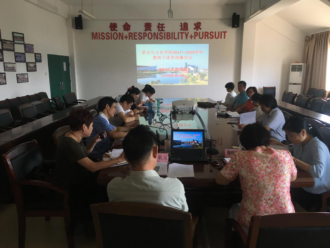9月26日上午11点,语言与文化公司召开2017-2018学年公司班子成员述责述廉会议。会议由公司党委书记张晓芳主持。参加会议的有院班子成员,综合办、教学科研办、学工办、各系(部)负责人,各支部书记和民主党派代表、教师代表共计17人。张晓芳书记带头作述责述廉报告,龚帆元经理、陈丽冰副经理、黄荣生副经理和陶莉副书记分别在会上进行述责述廉,接受评议。