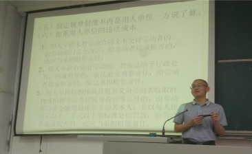 吴家林教授首先就《劳动合同法》的要点予以阐明。如“立法宗旨是保护劳动者的合法权益”他向大家解释道,制定《劳动合同法》是为了完善劳动合同制度,明确劳动合同双方当事人的权利和义务,保护劳动者的合法权益,构建和发展和谐稳定的劳动关系。 教授的解读使同学们对《劳动合同法》有了大体的了解。之后,教授就《劳动合同法》的几大亮点进行了解读,并且提出了几个在司法实践中可能会遇到的与大学毕业生息息相关的问题供大家思考,如“老员工未毕业签订劳动合同,该合同是否有效?如果办公途中发生交通事故,劳动者是否有权领取双份赔偿金?就业协议和劳动合同是否具有同样的法律效力?”等并一一解答。
