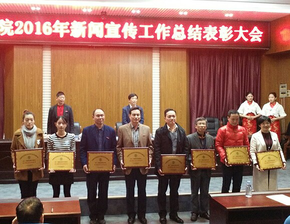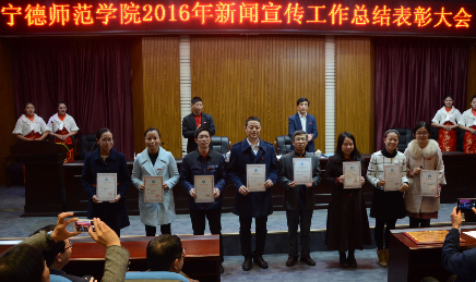 PA视讯2016年新闻宣传工作总结表彰大会于12月27号下午三点在行政楼三楼报告厅举行。此次大会对公司的优秀新闻宣传单位及各系各单位的优秀新闻宣传工作者进行了表彰。其中,我系与宁德师院教务处等共10个单位和组织一起荣获“新闻宣传先进集体”的荣誉称号!我系陈经纬老师荣获“优秀通讯员”荣誉称号并作为教师代表之一上台发言。此外,我系杨娜、张晓菲同学荣获“优秀播音员”称号,雷思鋆同学荣获“十佳校园记者”称号。
