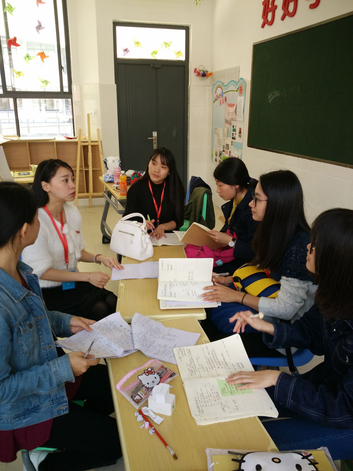 实习生入校后先开始听课,10月24日开始正式走上讲台亲自授课,11月17日开始为期两周的汇报课。每位同学一次汇报课。今日是王晓琳同学的汇报课。杨广烨老师和钟晶晶,林琴等七名实习生走进五年一班的英语课堂,聆听了晓琳同学的英语汇报课。晓琳同学表现沉稳,汇报课圆满成功。课后,杨广烨老师集中所有实习生在“实习生指导室”对王晓琳的汇报课进行了集体评课,对王晓琳的课堂表现进行了评价,指出优点和提出指导意见。评课后晓琳同学对大家的点评表示感谢,并且觉得获益匪浅。