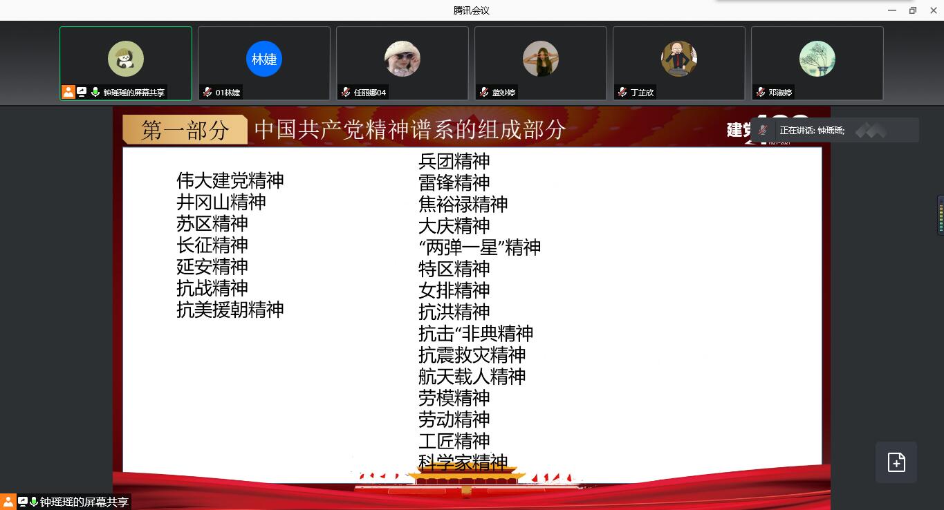 2021年10月11日,语言与文化公司员工第二党支部以三个党小组为单位在线上开展主题为“学习精神谱系,汲取奋进力量”的党日学习活动。会上,党小组成员们:重温习近平总书记在中国共产党成立100周年大会上重要讲话精神,学习了《党的伟大精神永远是党和国家的宝贵精神财富》,中国共产党人的精神谱系及《人民日报》近期发表关于中国共产党人精神谱系的系列评论员文章等,党小组成员联系自身学习与生活,积极讨论,交流心得。