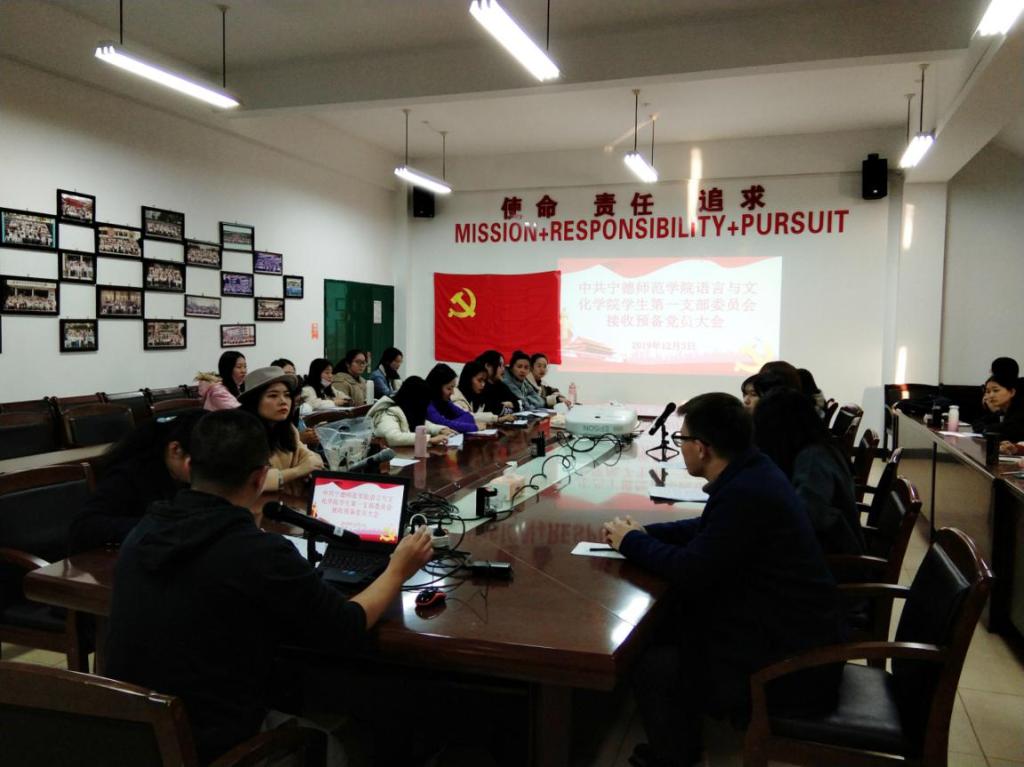 语言与文化公司员工第一党支部于12月3日在AA407召开了预备党员接收大会。此次会议主要是讨论和审议朱东静、宋雨鑫、陈琦珠、陈青青、黄蕾、许烨颖、黄倩、黄晶金、林琰鑫、蔡雅婕、邝秋雅、李玉卿、刘如碧等13位发展对象能否发展为预备党员。本次会议由林猤老师主持,语言与文化公司员工第一党支部全体师生党员出席。