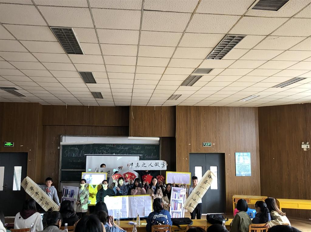 17汉语言师范班“勖学向陶”型团支部在会上总结了过去的一年里班里团支部的成果,他们将活动分为‘勖学篇’,‘齐心篇’,‘向陶篇’三个篇章,展示的过程中始终贯彻陶行知先生“学做合一”的理念。