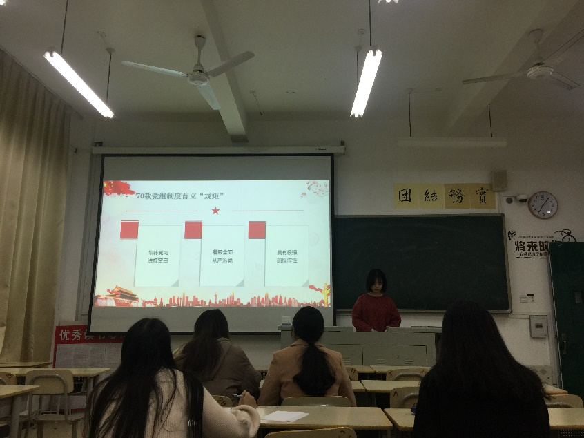 第二党小组组长陈凯玲简述了《中国共产党党组工作条例(试行)》相关内容,并利用多媒体平台播放相关动画视频,以生动有趣的方式带领小组成员学习,加深了党员同志对党组织的认识。