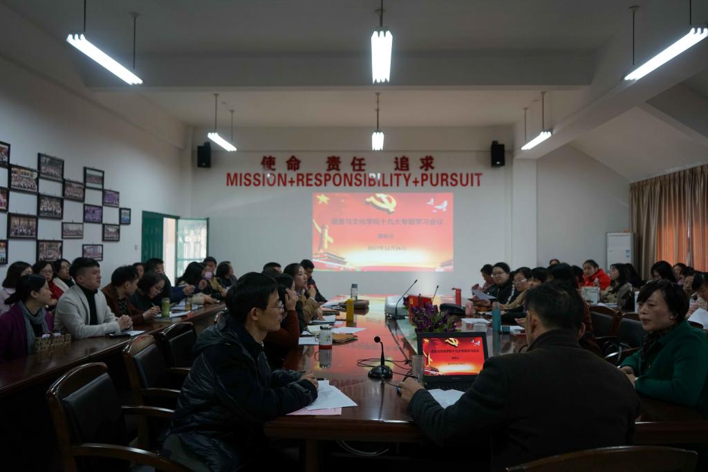 12月26日下午,语言与文化公司在求知楼A407会议室组织全体教职员工召开十九大专题学习会,公司党委书记张晓芳主持会议,经理龚帆元做主题宣讲。