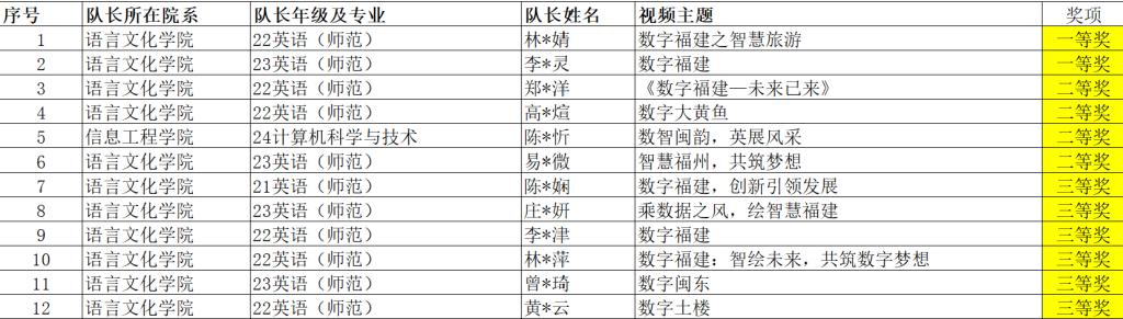 本次大赛作品要求围绕“数字福建”这一主题,展现福建在数字经济、智慧城市、数字政府、数字社会等方面的建设成果和发展趋势。视频素材可以来源于网络,但需在视频中明确体现视频来源和参赛人员姓名,视频时长不多于5分钟,格式以Mp4格式报送,字幕需为中英双语形式,选手需自行配上英文音频,不得直接采用网上音频,可采用抖音、剪映等新媒体手段拍摄制作,保证摄制画面声音稳定清晰。参赛选手需至少2-5人组成一队参加,可跨院、跨专业、跨年级、跨班级组队。参赛队伍需选出一名代表作为队长,与指导老师进行沟通作品的制作等详情。本次比赛共收到51份作品,经过大赛评委的认真评审,最终确定了大赛的获奖结果,一等奖2名,二等奖4名,三等奖6名,优秀奖若干名。