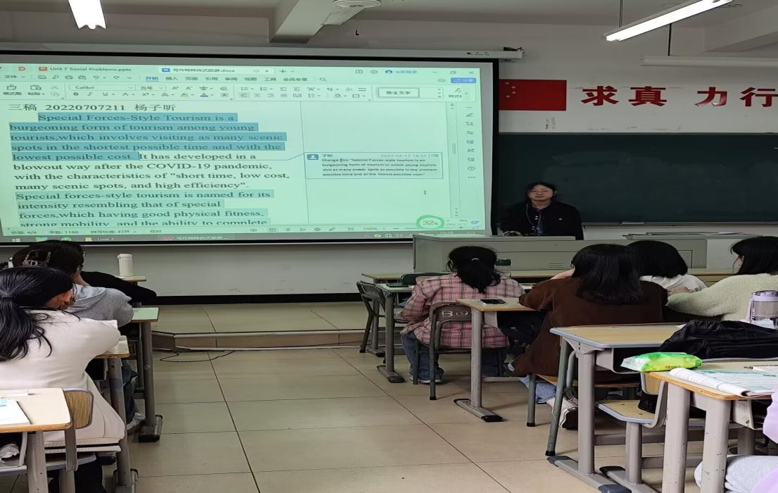 本堂课的教学内容是“第七章 社会问题(段落写作中的因果分析法)”。游灼梅老师采取线上线下混合式教学模式,首先线上通过学习通布置写作任务和小组协作写作活动,线下让员工现场陈述一稿、二稿、三稿的写作思路,并且采取让员工依据评分标准实现自我评估和教师点评的多元评价体系评估员工的习作。接着游灼梅老师通过让员工观看本课话题相关的视频和导启发式问题导入本课主题,通过具体案例分析因果分析法发展锻炼的组织形式、写作连贯技巧及遣词造句技巧。本次示范课坚持成果产出导向的教学理念,以员工为中心,设计了多元化教学活动,充分调动了同学们的学习积极性和主动性。在课堂氛围、课堂互动、课堂效果等方面均获得了师生的一致好评。结合本次示范课程中的所学所思,观摩教师对如何提升线上线下混合式教学质量,关注员工学习效果有了更深刻的认识。