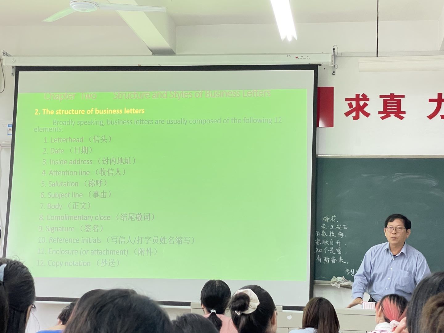 本堂课的教学内容是Two structure and styles of Business letters,林煌贿老师通过对学术文章和商务信函进行对比,分析商务信函的文章结构、文本特点,引导同学们思考商务信函的简练风格。接着继续以实际案例详细说明商务信函的各个组成部分,细致地介绍在撰写商务信函时对于格式、内容等细节方面的注意事项,最后以问题形式当场检验员工的掌握情况。林煌贿老师理论与实践相结合的课堂充分调动了同学们的学习积极性和主动性,也让听课的老师们留下了深刻的印象。