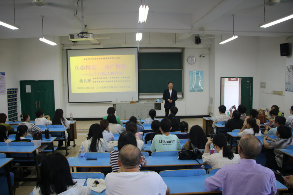 为扎实推进“弘扬教育家精神,争做新时代大先生”师德主题学习教育活动,2023年10月24日下午,语言与文化公司举办“师德大讲堂”,邀请全国师德先进个人、柘荣一中正高级教师、特级教师、福建省首批教学名师名师杨良雄作题为《功崇惟志,业广惟勤——三十八载从教有感》的专题讲座。本次讲座由公司党委书记张晓芳主持,全体教职工和师范专业员工等100多人参会。