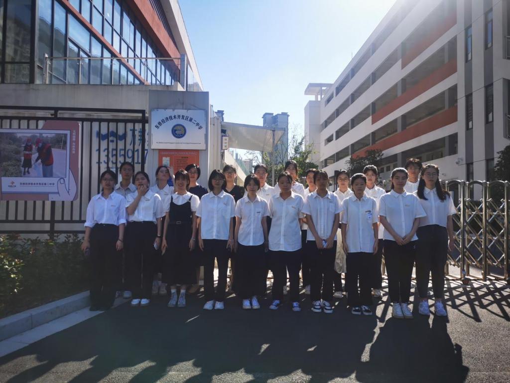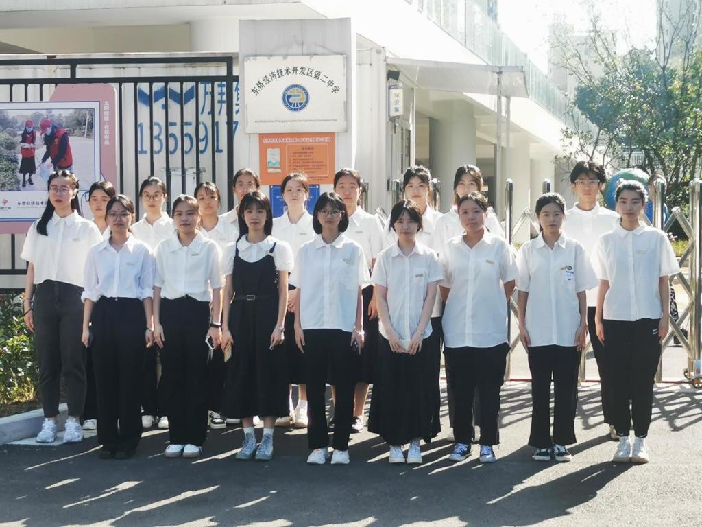 在2位带队老师叮嘱实习相关事宜与注意事项后,与18名实习同学在东侨二中合影留念。
