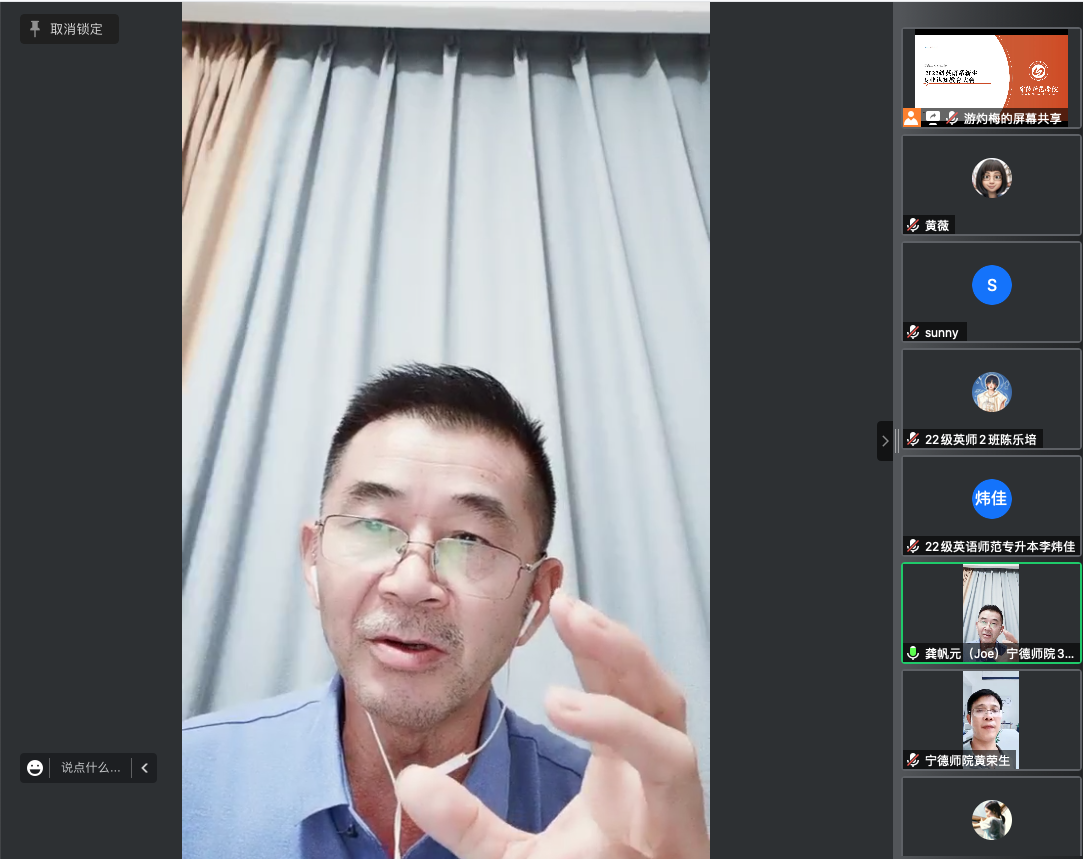 2022年9月15日晚上,英语系于腾讯会议线上召开了2022级英语专业新生教育大会,副经理黄荣生、副书记陶莉、专业带头人龚帆元、系主任游灼梅、系副主任黄薇及三位学习班主任等教师参加了此次动员大会,会议由游灼梅老师主持。
