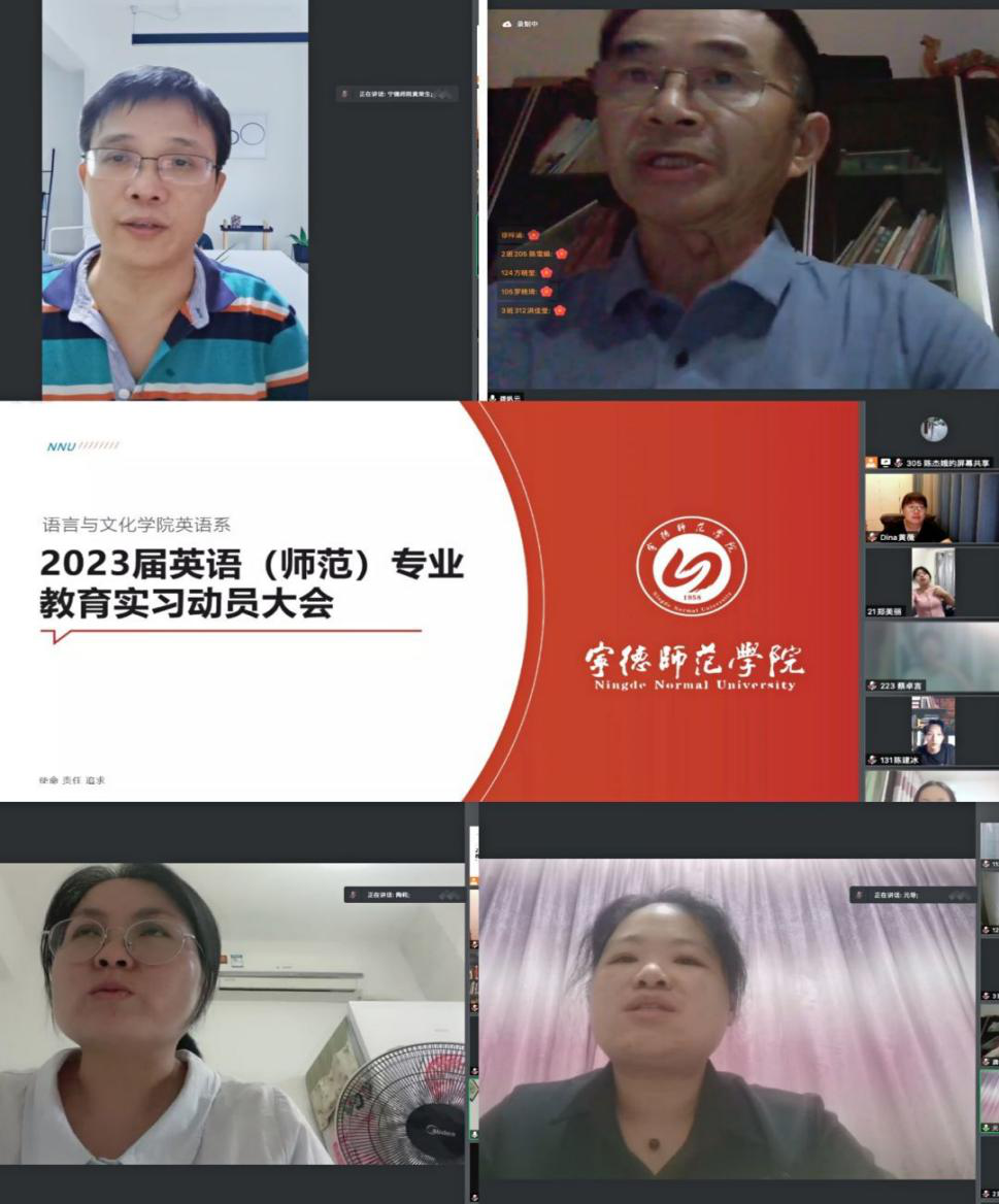 2022年9月1日晚上,英语系于腾讯会议线上召开了2023届英语(师范)专业动员大会,语言与文化公司副经理黄荣生、副书记陶莉、英语专业负责人龚帆元、辅导员元佳珺老师及系部校内指导老师参加了此次动员大会,会议由游灼梅老师主持。