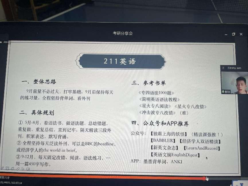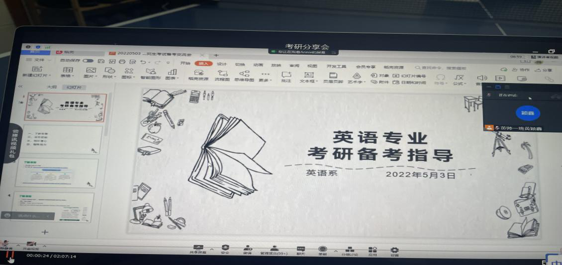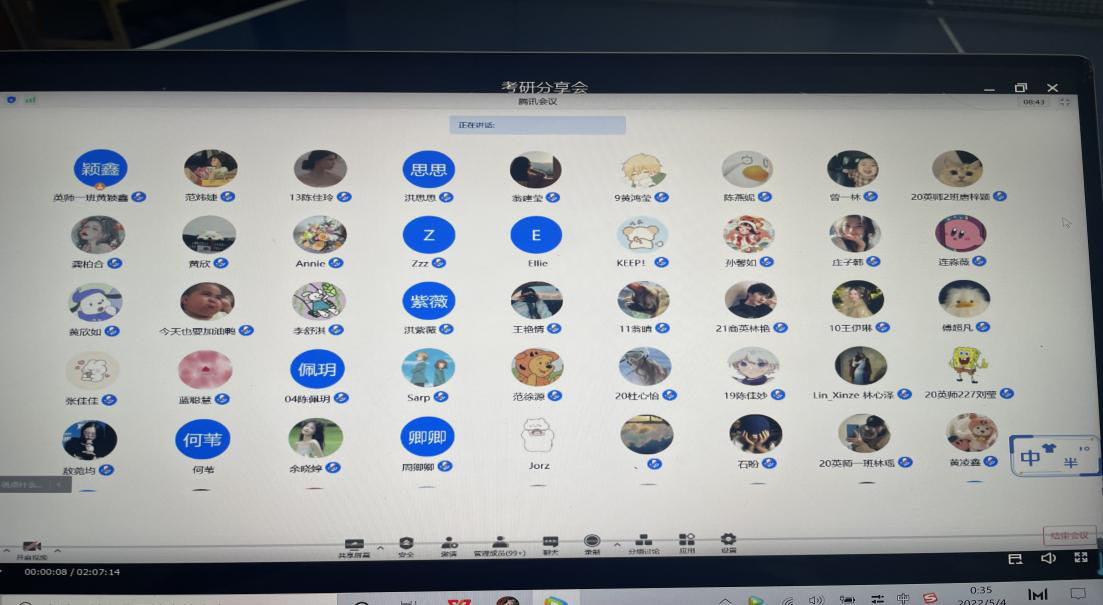 为加强英语专业员工学业规划和职业规划,明确英语专业员工的考研方向,提升英语专业员工备考技巧,2022年5月3日晚上19:00-21:00英语系通过腾讯会议线上形式开展了英语专业考研备考指导交流会。此次分享会由英语系林海英副教授主持,邀请到了考研成功的林涵锐,康秋香,阮婧祺,翁垣等英语专业学长学姐们进行分享,共计九十多位师生参加了此次考研交流会。