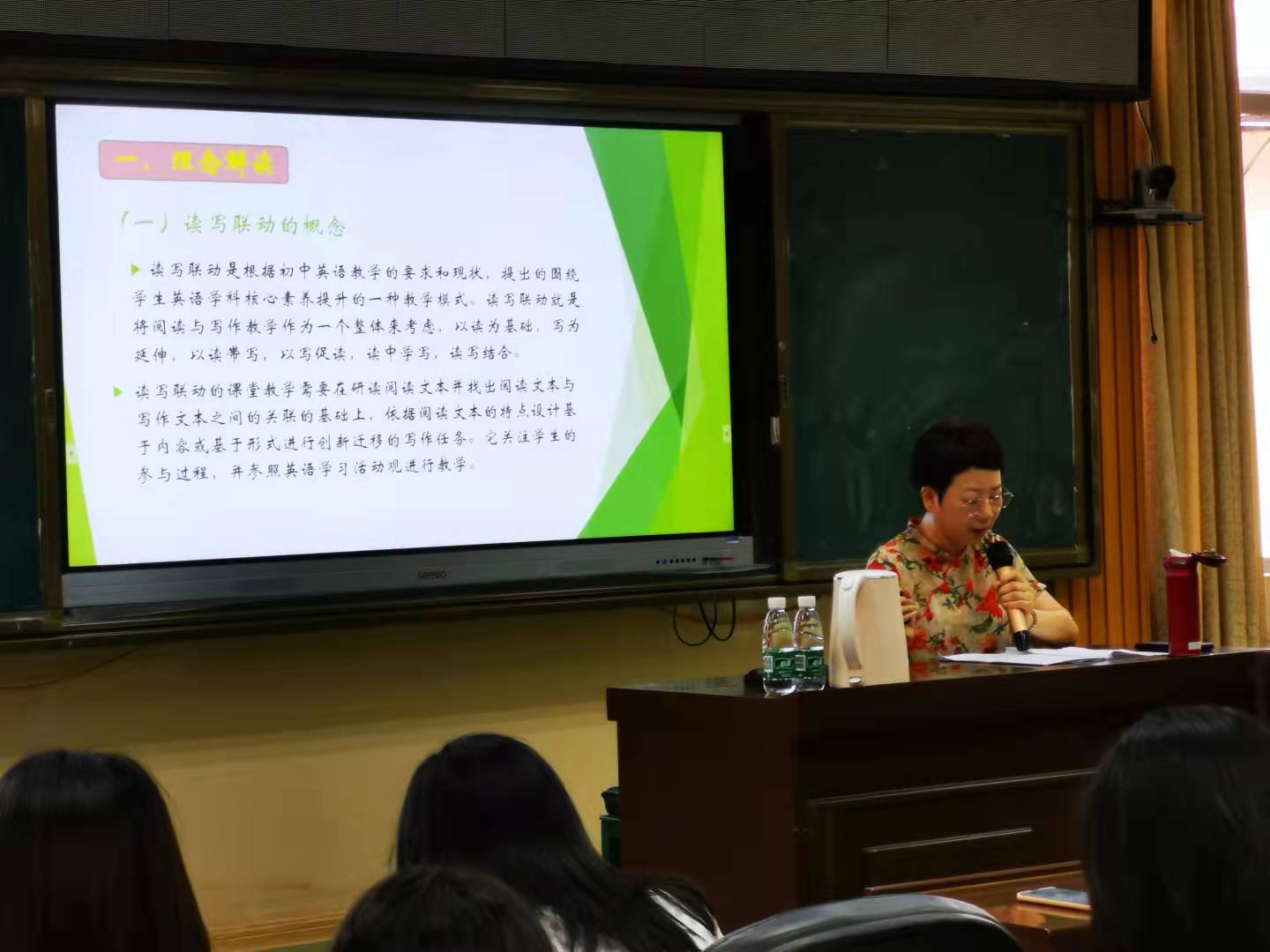 伴随着宁德市第十中学悠扬的上课铃声,我们与老师们齐聚一堂,一起学习黄老师对读写联动教学理念的独到见解。开篇,黄老师以理念解读为我们打开了这扇新教学理念的大门。紧接着,黄老师分别从读写联动的概念、读写联动的教学目的、读写联动的教学意义以及读写联动的理论基础入手,为我们详细介绍了读写联动的起源、发展以及在教学上的实践与应用,从而引出了读写联动教学理论之于课堂教学的途径与方法。
