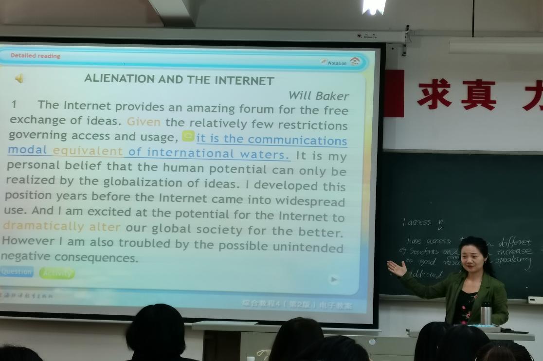 课上,两名员工先做presentation,一名员工针对课文重难点单词进行了5分钟的讲解及扩充,另一名同学挑选出文章中的几句重难点句子进行分析和翻译,巩固员工课前的预习成果。许老师在两位同学做完presentation后进行了逐一点评并提出改进意见。为了让员工更加深入了解课文内容,许老师采用多种教学方法,包括任务型教学法、调查法等。她首先明确Learning Objectives(学习目标),再从判断正误题以及分析the pros and cons of the Internet(英特网的利与弊)逐渐引入文章的主题。明确课文主题后,员工在许老师的指导下浏览课文,根据关键词找出各个段落的主题句,并分段概括各大部分(引入——主体——总结)的大意。经许老师的耐心引导和细心讲解,员工牢固掌握了课文知识点。