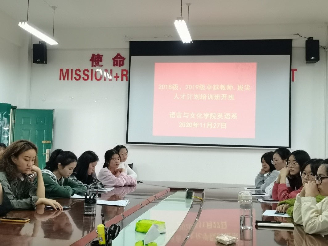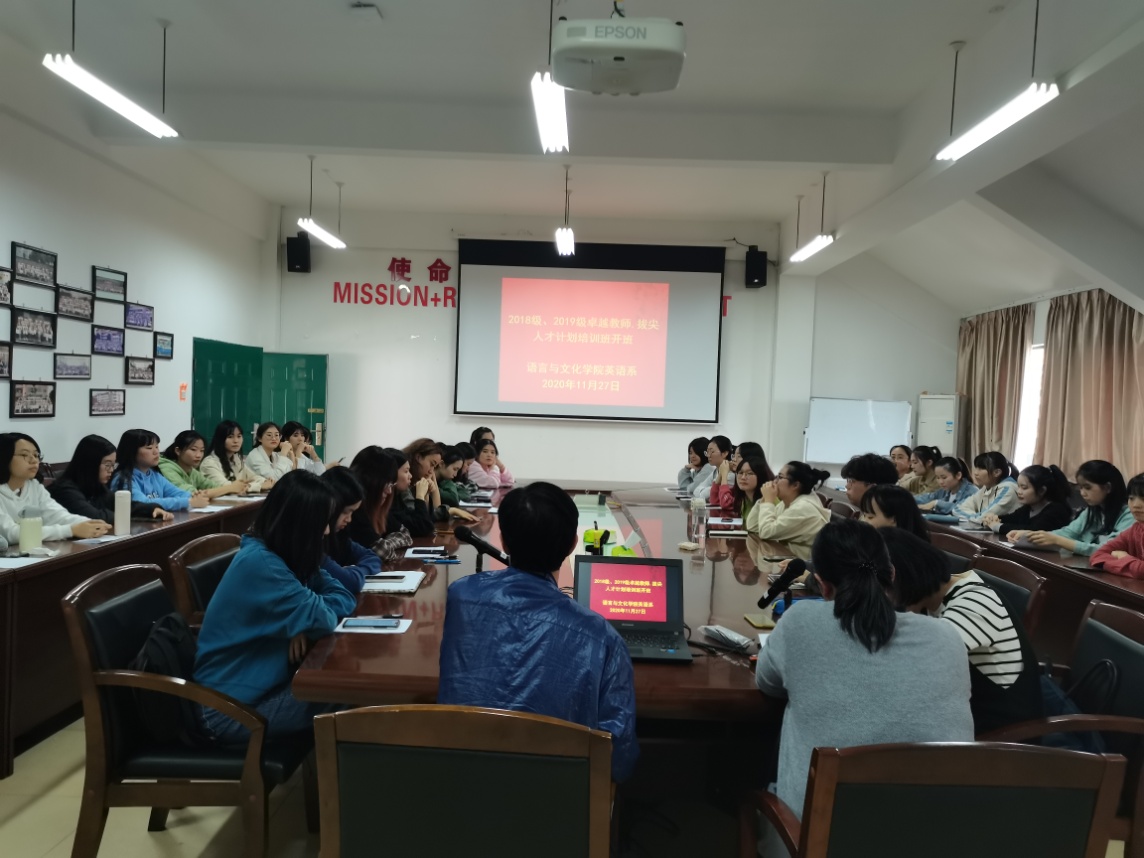 根据宁师院教【2019】11号文件精神,语言与文化公司英语系于2020年11月27日在AA407举行2018、2019级卓越教师、拔尖人才计划培训班开班仪式。分管教学副经理黄荣生、英语系正副主任游灼梅、黄薇、教研室主任刘晖、尤斌斌、部分培训教师及参与该计划的2018、2019级的41位员工参加开班仪式,仪式由游灼梅主持。