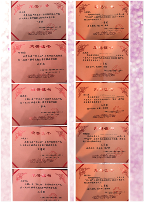 大赛包含两个奖项:教学设计奖和教学技能奖。教学技能比赛分由说课、模拟授课和现场问答三个单项比赛构成。公司选手们在指导老师们的精心指导下,凭借充足的赛前准备、清晰的教学思路、精彩的现场表现最终获得教学技能一等奖1项、二等奖2项、三等奖2项。郑心瑶同学获得教学技能一等奖和教学设计三等奖;邵韵琪同学分别获得教学技能二等奖和教学设计三等奖;张燕榕获教学技能二等奖和教学设计二等奖;王晓君获教学设计二等奖和教学技能三等奖;林安雨教学技能三等奖和教学设计三等奖。