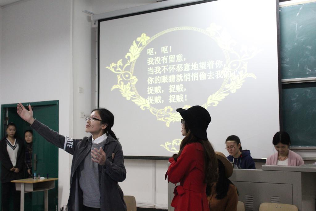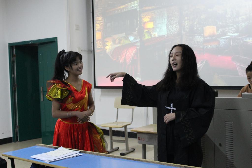 11月24日上午的第1234节课,是汉语言文学系副教授吴梅芳的《外国文学史》,这几节课她一改往日以老师讲授为主的方式,让2014级师范班和文秘班的同学们演出莎士比亚的剧作《李尔王》、《麦克白》《仲夏夜之梦》等名剧片段,同学们自己改编自导自演,全情投入,课堂顿时热闹非凡。在同学们看来“通过自身演绎,加深了对文学作品的理解,知识的掌握也因此变得更加牢固”。