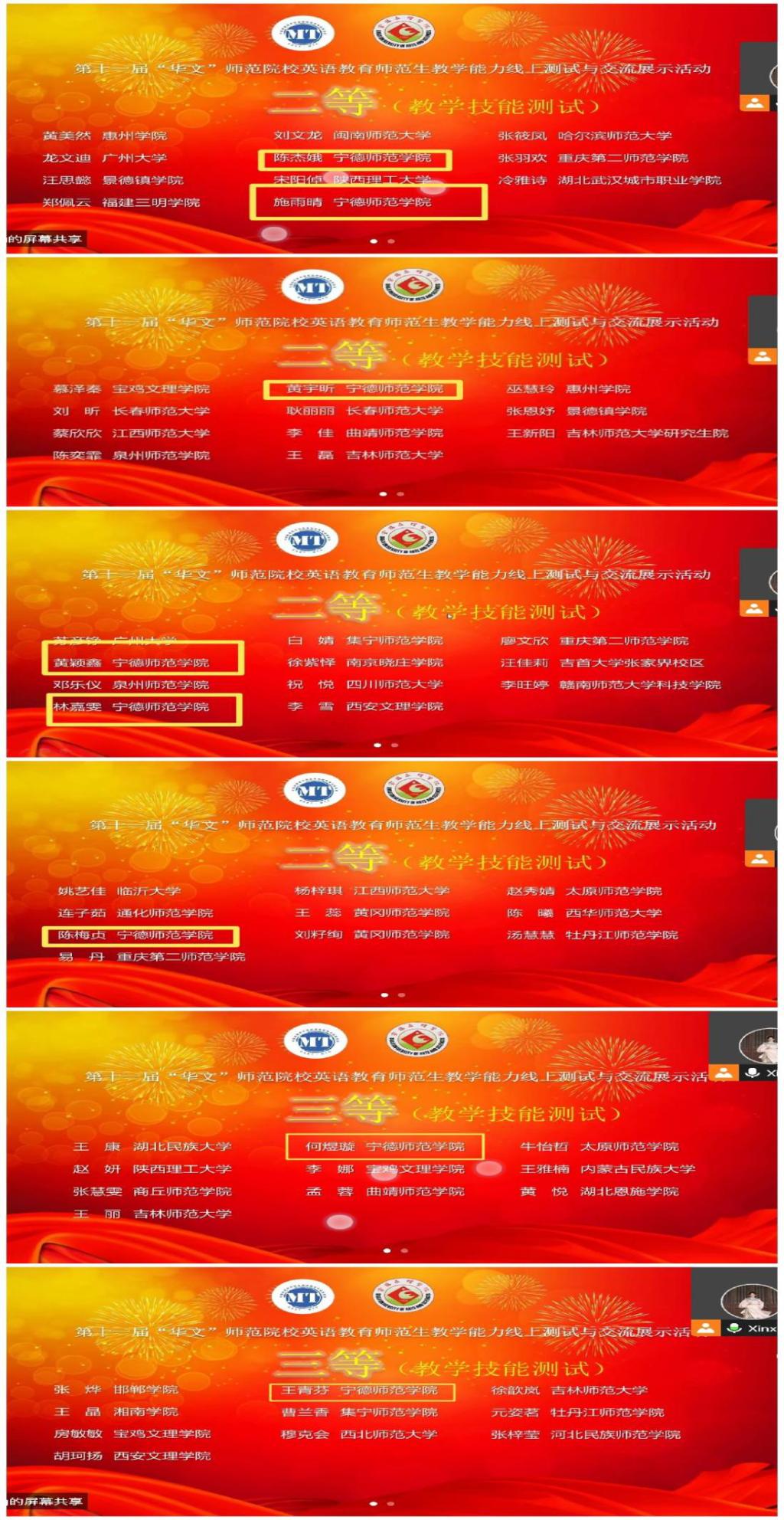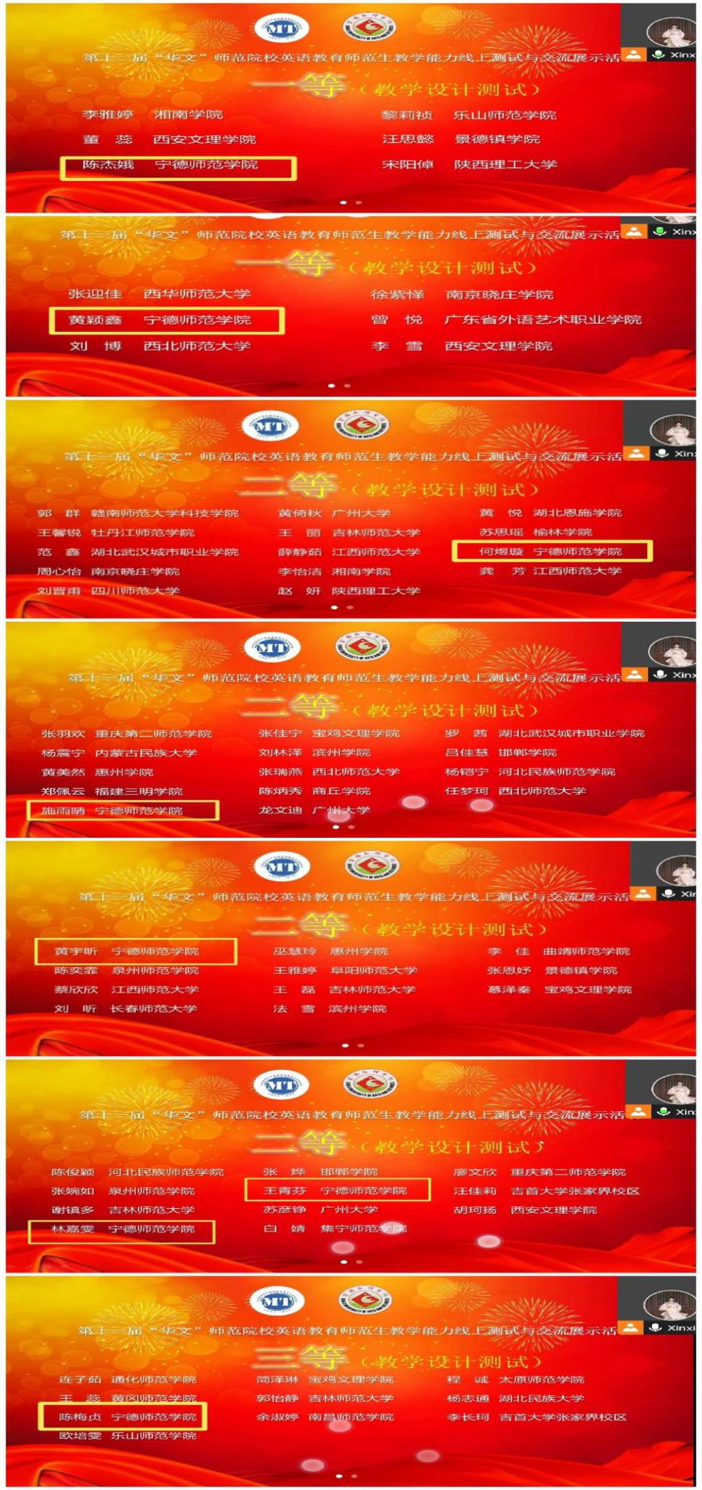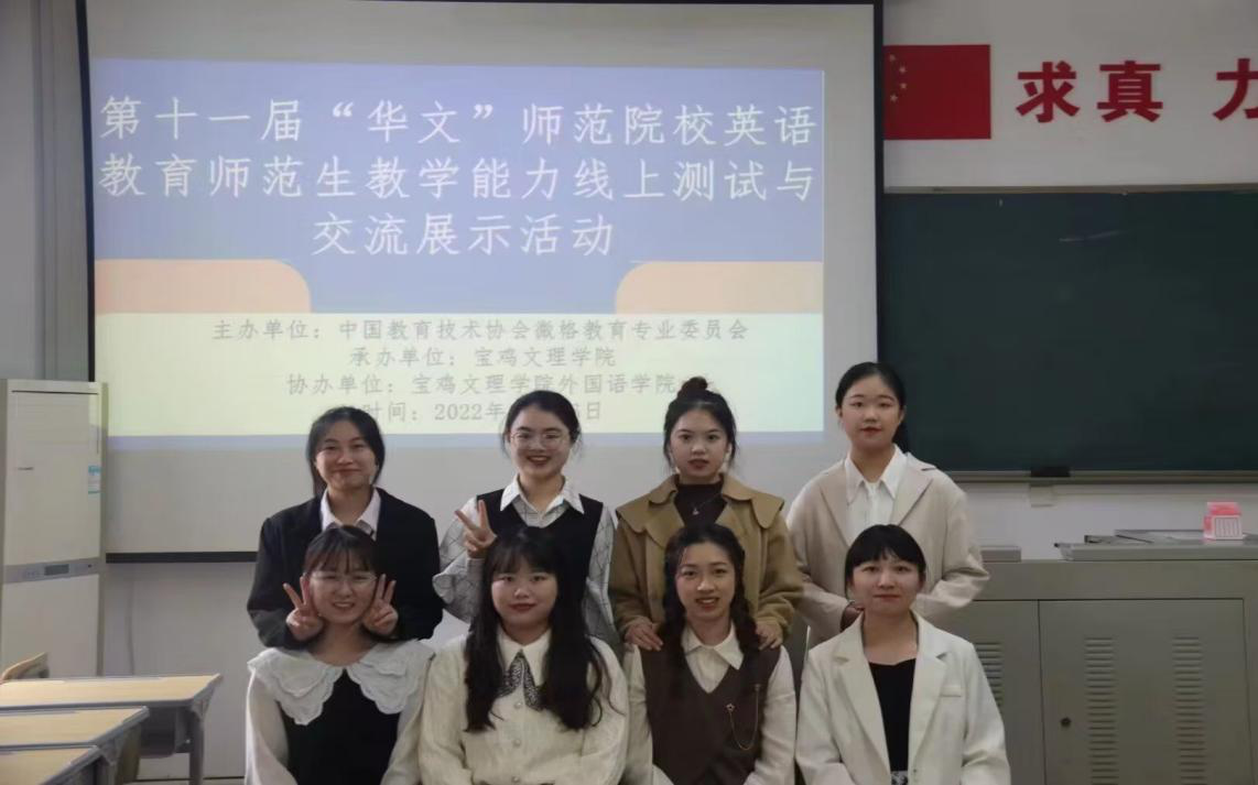 11月25-27日,由中国教育技术协会微格教学专业委员会和宝鸡文理公司共同举办的第十一届“华文”师范院校英语师范生教学能力线上测试与交流展示活动在宝鸡文理公司举行。本届大赛的354位员工来自华中师范大学、哈尔滨师范大学等全国50多所高校。公司英语系共组织8人参赛,获得教学设计一等奖2项、二等奖5项、三等奖1项,教学能力二等奖6项、三等奖2项。