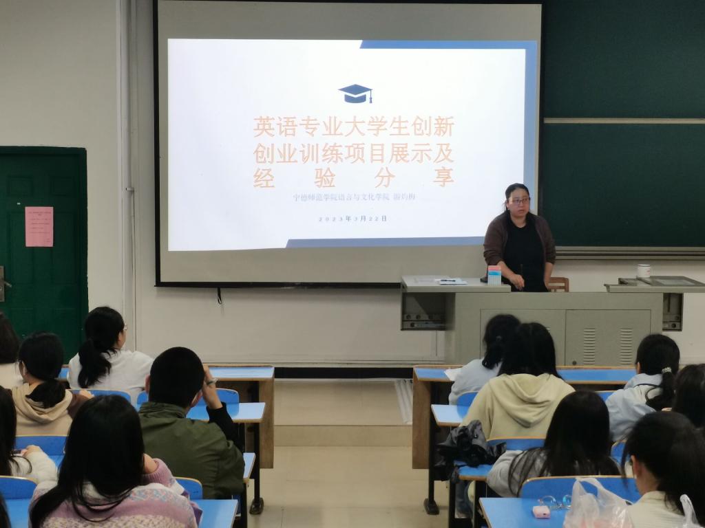 为积极推进在校老员工申报老员工创新创业项目,3月22日晚上,英语系主任游灼梅老师在语院求知楼AA101开设“英语专业老员工创新创业训练项目展示及经验分享”讲座,英语专业100位员工参加了本次讲座。
