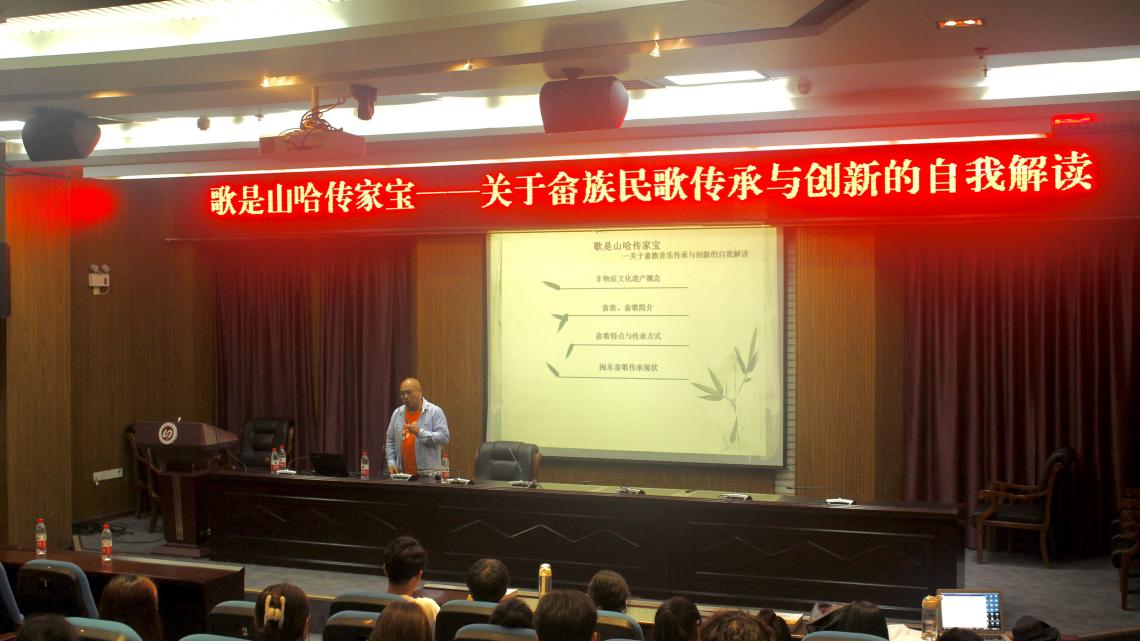 雷志华老师用生动形象的语言,向同学们介绍了畲族与畲歌的定义、畲歌的特点与传承方式,并结合自身经历,阐述了对畲族民歌传承与创新的思考。讲座过程中,雷志华老师演唱了其代表作《歌是山哈传家宝》等曲目,并现场教唱畲歌。最后,雷志华老师指出,希望同学们能够积极了解畲族文化,体会畲族民歌的独特魅力。