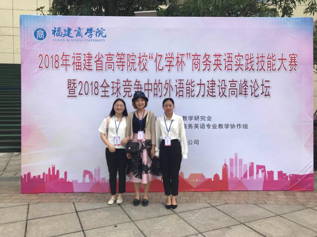 5月25日至26日,2018年福建省高等院校“亿学杯”商务英语实践技能大赛暨全球竞争中的外语能力建设高峰论坛会在福建商公司召开。此次大赛由福建省大学外语教学研究会主办,教育部高等公司商务英语专业教学协作组协办,福建商公司承办,厦门亿学软件有限公司提供技术服务支持。公司2015级胡雅迪,2016级陈方舟和2017级陈璟三位同学组成一个团队,参加了此次比赛,并获得了三等奖。