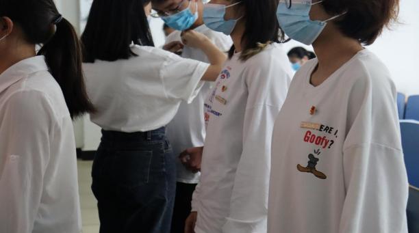 团委委员郭佳怡、蔡艺婷为新团员佩戴团徽