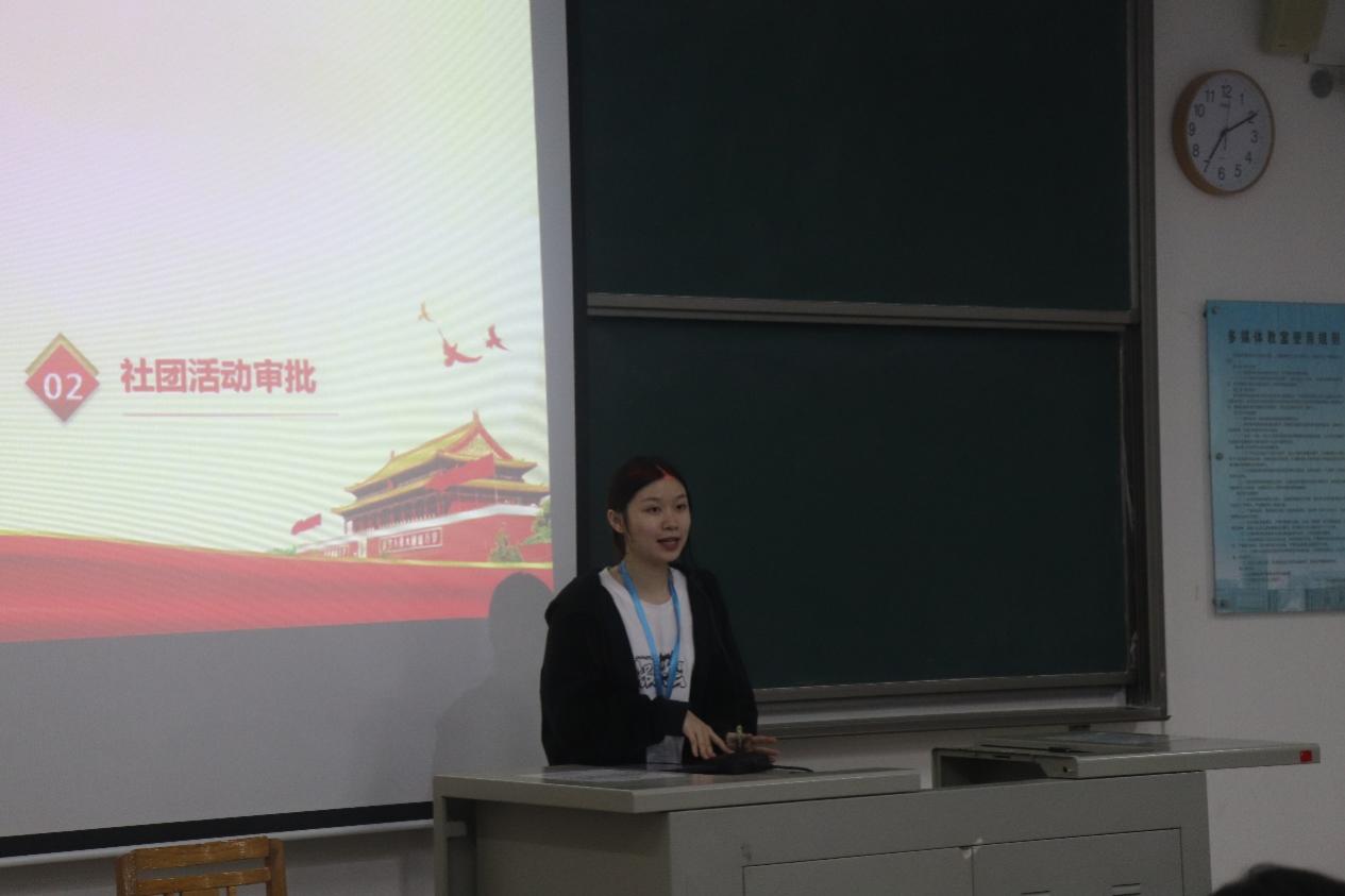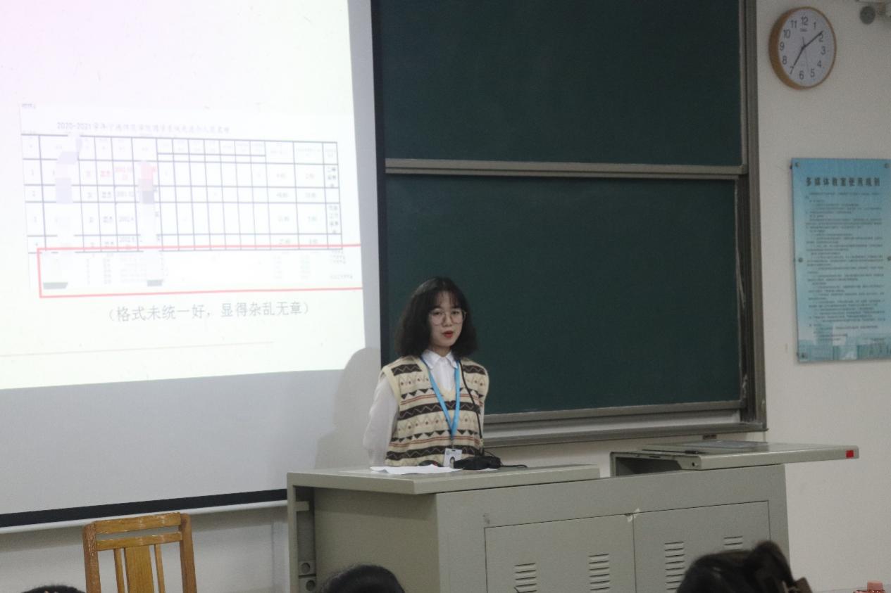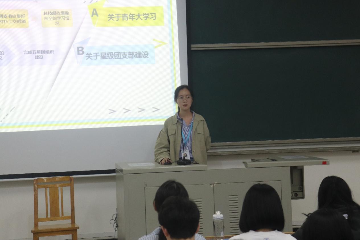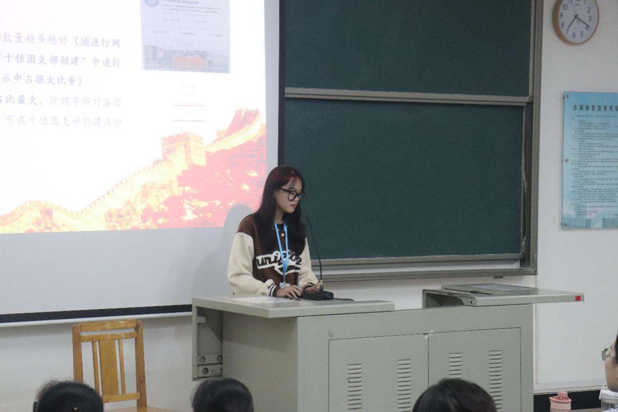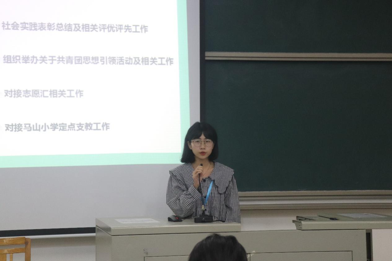综合部的郭伊霜针对发展新团员、五星团支部创建、评优评先和团员档案整理等几个方面结合具体事例进行讲解。组织部的洪嘉玲介绍了团日活动组织、活动审批等内容,重点对接收通知、提交材料规范等明确了详细要求。此外,实践部的蔡艺婷也对针对暑期社会实践和马山支教志愿服务等工作,进行细致的介绍。
