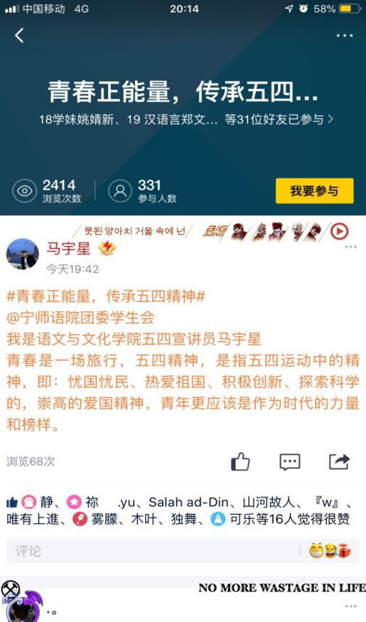 2020年5月4日是第71个中国青年节也是五四运动101周年纪念日。为引领新时代青年继承弘扬五四精神、正确认识责任使命,语言与文化公司开展了以“青春正能量 传承五四精神-我是五四精神宣讲员”为主题,以在QQ空间打卡发送与五四及抗疫英雄相关的小故事小知识为活动形式,重温五四岁月、讴歌抗疫战士。本次活动得到了全体同学的积极参与、热情响应,浏览次数高达2414人次,参与人数共计331人。