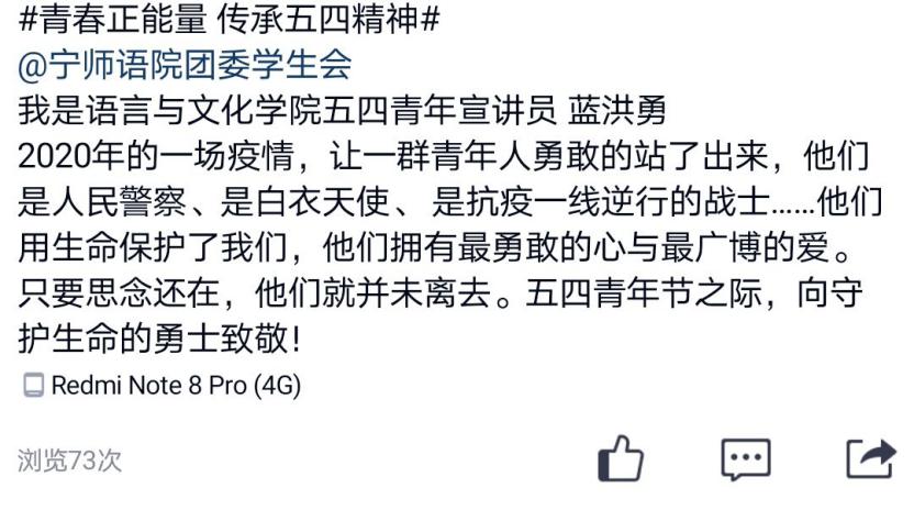 我们引以为荣,讴歌抗疫英雄,他们将五四精神践行在行动中。正如公司2019级预科2班的宣讲员蓝洪勇同学所说,“2020年的一场疫情,让一群青年人勇敢的站了出来,他们是人民警察、是白衣天使、是抗疫一线逆行的战士...他们用生命保护了我们,他们拥有最勇敢的心与最广博的爱。只要思念还在,他们就并未离去。五四青年节之际,向守护生命的勇士致敬 !”