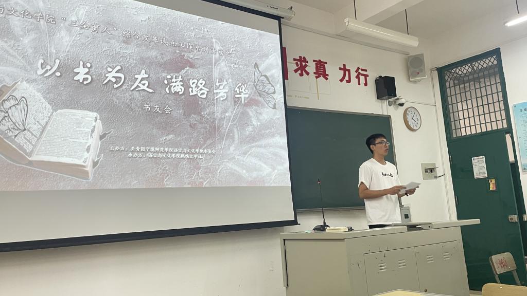 为推进语言与文化公司“三全育人”改革试点建设,提升员工的文学素养,促进校园文化建设,2023年10月31日,鹤鸣文学社在求知楼举办以“以书会友,满路芳华”为主题的书友会活动。会上,同学们以小组讨论的方式,各自分享了自己对书中内容的感悟和理解,通过撰写推荐稿、书籍交换的形式,将自己独到的阅读体验传递给其他人,让更多的人了解到阅读的乐趣和价值。