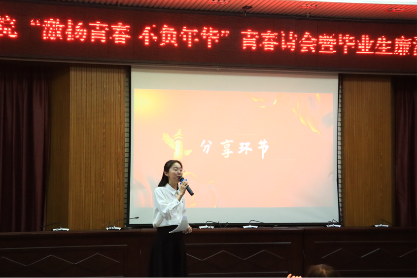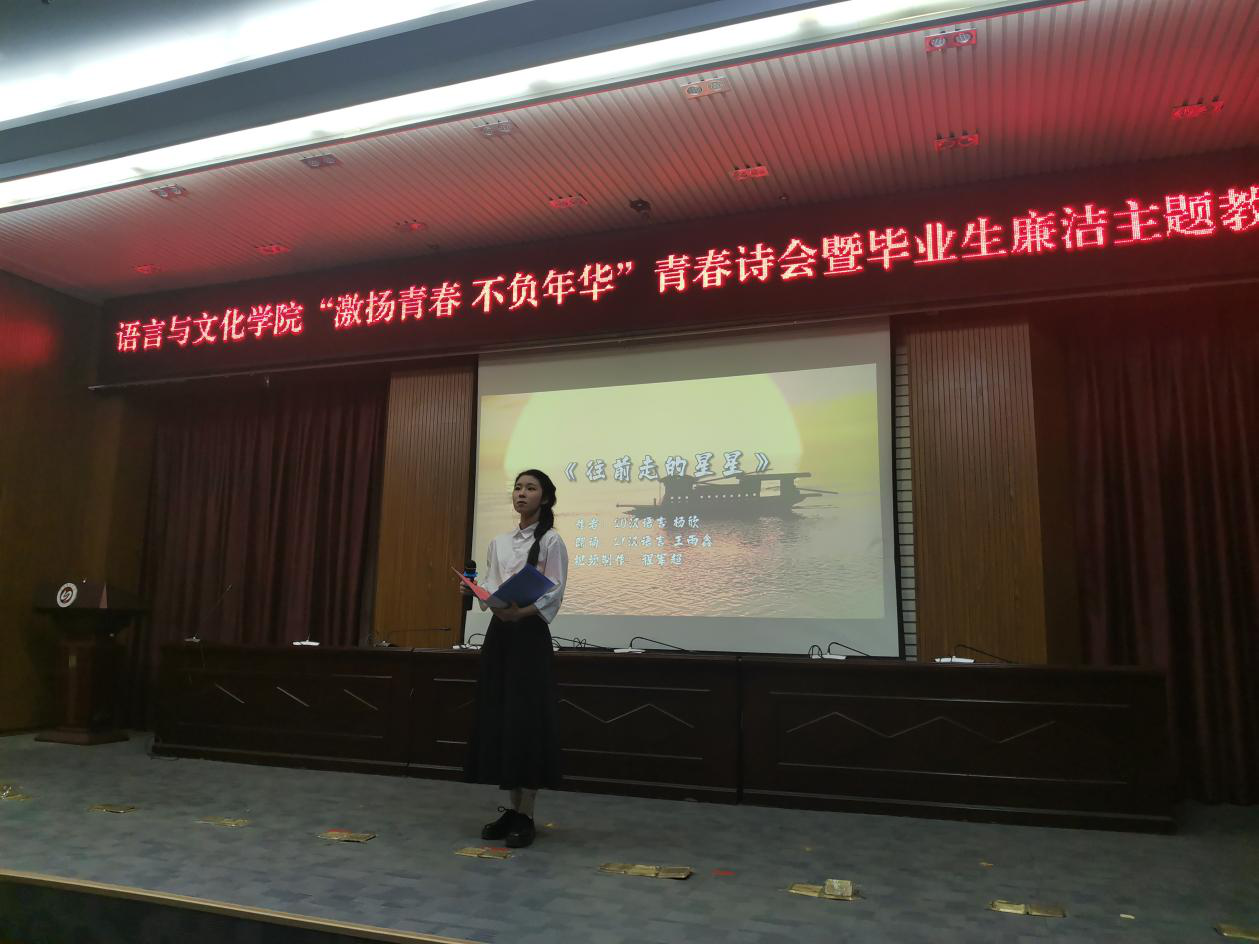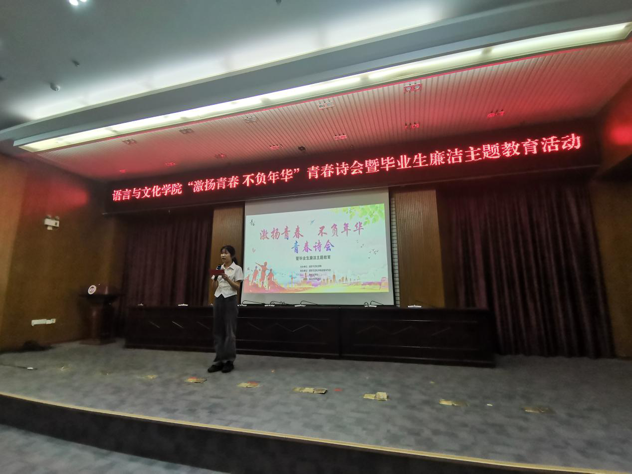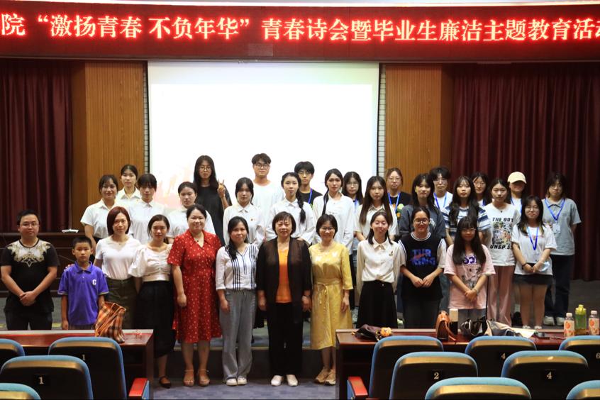 为更好在主题教育中推动公司青年师生深入学习贯彻习近平新时代中国特色社会主义思想,做好毕业生离校前廉洁教育,6月10日晚,语言与文化公司在行政楼报告厅举办以“激扬青春 不负年华”为主题的青春诗会暨毕业生廉洁主题教育活动。公司党委书记张晓芳、公司党委副书记陶莉、院团委书记元佳珺、鹤鸣文学社指导教师许陈颖、辅导员林猤、姜婷婷、李雪、江培春出席本次活动。