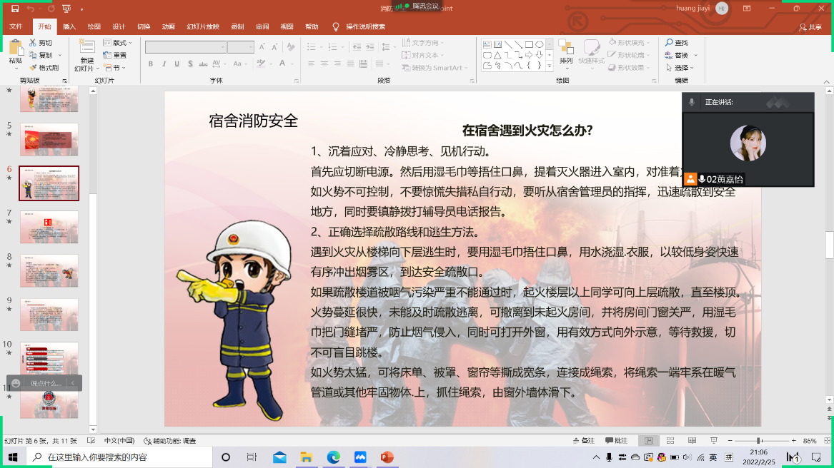 李敏(21网络与新媒体班):文明在于细节的处理,安全防患于未然。通过这次的消防安全主题班会,我班的消防安全意识有所加强,同时也大大提高了大家的消防防范意识,积极地以行动来响应这一班会主题。在此次消防安全主题班会中我们对取暖电器和插排的使用安全,如何选购正规产品,离开时关闭电源等有了深刻认识。此次班会意在提高大家对于消防安全的重视程度,掌握自护自救能力。让我们积极付诸于行动,形成一个人人关心消防安全的浓厚氛围,使消防安全深入人心。
