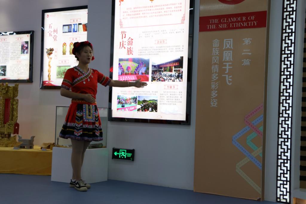 决赛分为两个部分,“畲族的形成与发展——戎耕史诗”与“畲族的民俗文化——凤凰于飞”。畲族是中国东南地区的一个古老民族,广东潮州凤凰山相传是畲族的祖居地。畲族自称“山哈”,意思是“来自山里的客人”。1956年12月,经过民族识别工作,畲族作为单一民族被正式确认。在进馆门右侧的序言板和历史革命板前,选手为我们讲解了这两块板上讲述的闽东三年游击战争时期畲族人民的革命故事。在沙盘前,选手们为我们介绍了畲族的发展与迁移。在节庆图片前,选手向我们讲述了畲族的民俗文化,涵盖了衣食住行与婚嫁节庆。