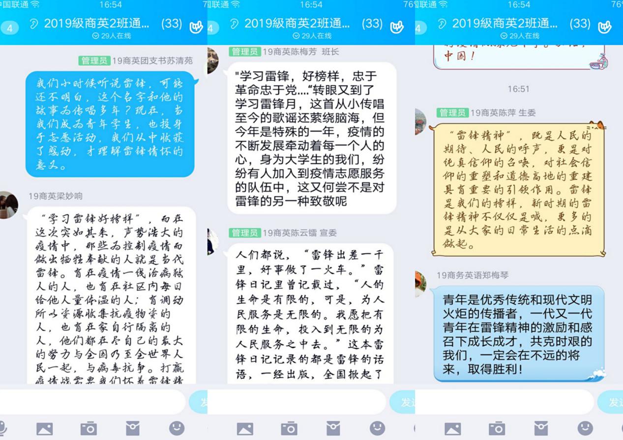 为了更好的学习雷锋精神,向我们身边的先进员工抗疫志愿者看齐,2020年3月5日在PA视讯语言与文化公司团委的号召下,公司各班级团支部以“学习雷锋精神,争做青年防疫志愿者”为主题组织开展了一次意义深刻的线上团日活动,通过学习公司员工抗疫志愿者的先进事例作为切入点,传承弘扬“雷锋精神”。本次活动反响热烈,起到了良好的学习发扬“雷锋精神”的效果,也向广大青年员工发出号召,要以自己的实际行动积极践行“雷锋精神”。学习“雷锋精神”不应该仅仅停留在喊口号上,更应该从我做起,从身边的小事做起,在当前防疫抗疫的大局上尽己所能做好每一件事。
