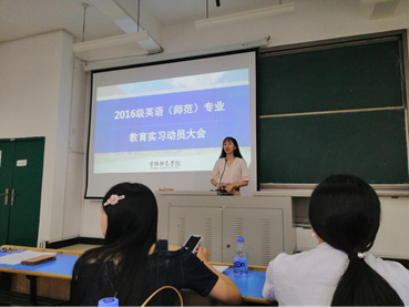 接着16级英语师范班实习生代表发言。实习生代表表示毕业生们都将秉持积极向上的心态,专心专注投入实习工作中,在实践中展现自我。游灼梅老师在介绍教育实习大纲具体要求及实习分组情况后,对此次动员大会做出了总结。