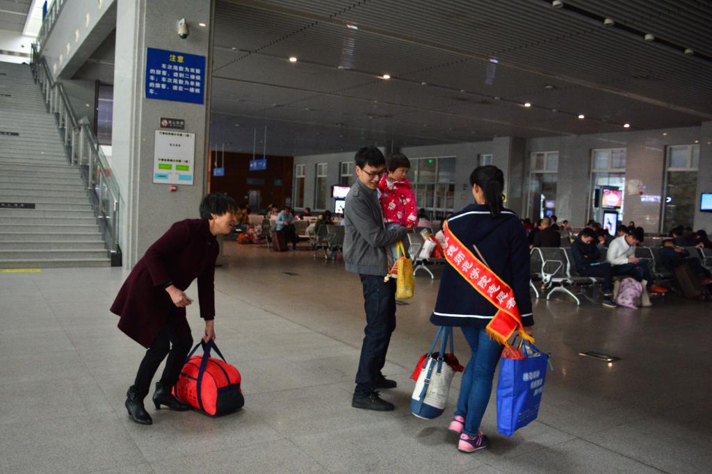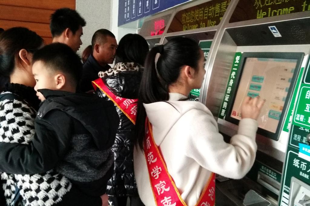 一位练姓大叔因为错过了发车的时间,向志愿者淋萍求助,于是淋萍带他去售票处改签。练大叔顺利拿到改签后的车票不断地对志愿者们说谢谢。