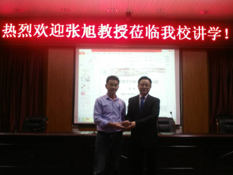 讲座一开场,张旭教授便以视频的形式,把全体师生带入了他的讲座。视频是关于福建工程公司人文公司的公司风光,短短的十几分钟让大家都深刻体会到人文公司优秀的公司风采、教师风采以及员工风采。于是张旭教授以友之名赠送我系龚帆元主任视频U盘并合影留念。接着,张旭教授分享了他在福建期间的新成果、部分研项目,其中的一部《风筝不掉线》便是他的著作。张旭教授还介绍了演绎法、归纳法等翻译学的有关知识方法,并鼓励我们对待知识要不断归纳、不断积累,要在广泛阅读的基础上培养自己独立思考、独立判断的能力,避免人云亦云。从现在开始,实实在在的做起,他坚信有心的人一定会成功,这让在场的全体师生都受益匪浅。然后张旭教授给我们分享了一系列诗歌鉴赏,并总结说每个人要有自己的特色,与别人不一样的特色,再全方面发展自己。最后,张旭教授表示希望我系学子能在未来中走向优秀,成就更好的自己。