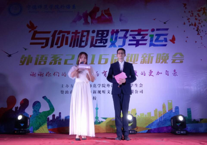 11月8日晚,英语系2016级迎新晚会“与你相遇好幸运”在求知楼英语角举办。英语系主任龚帆元、党总支书记陈茂和、辅导员元佳珺、王晓莹、教学秘书陈经纬、外教Mike等到场观看晚会。