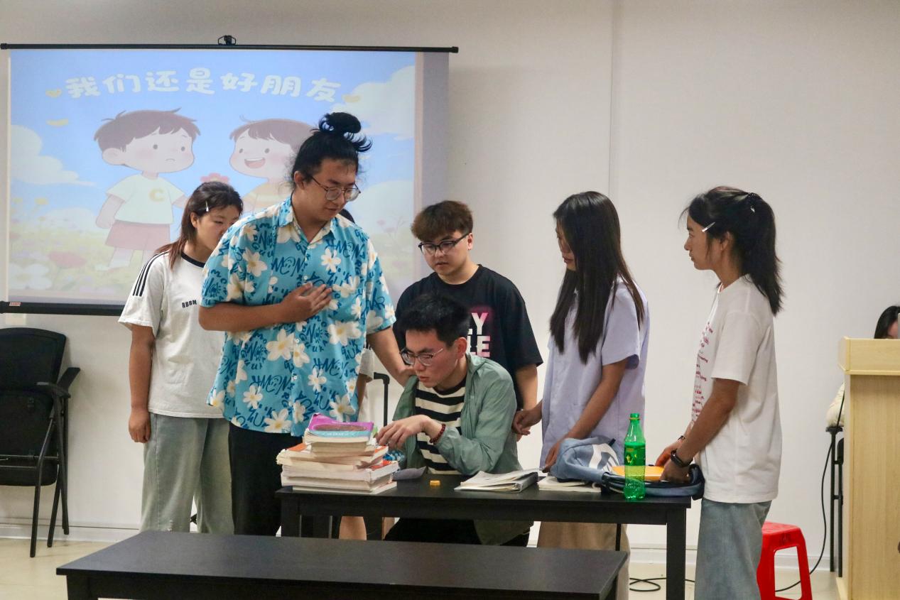 比赛现场,参赛队伍聚焦友情、自卑等现实话题,演绎老员工的心理成长历程。24级汉语言文学(师范)一班的作品《内耗》刻画了老员工因同学比自己优秀而产生的内心焦虑与自我内耗,展现了当代员工在竞争环境下的心理困境与成长感悟。
