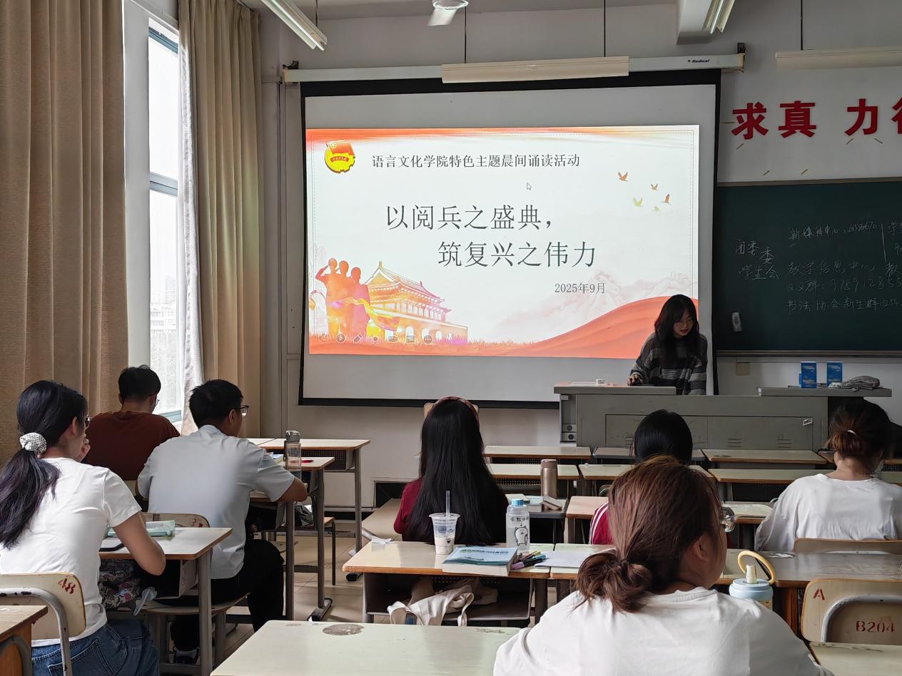 为了深入贯彻落实爱国主义教育要求,将九三阅兵盛典中蕴含的民族精神、家国情怀与青年担当深度融入校园文化建设,把抗战精神转化为奋进新征程、建功新时代的强大动力,公司团委于2025923日至929日开展“以阅兵之盛典,筑复习之伟力”主题晨间诵读活动,语院24个团支部积极参与本次活动。